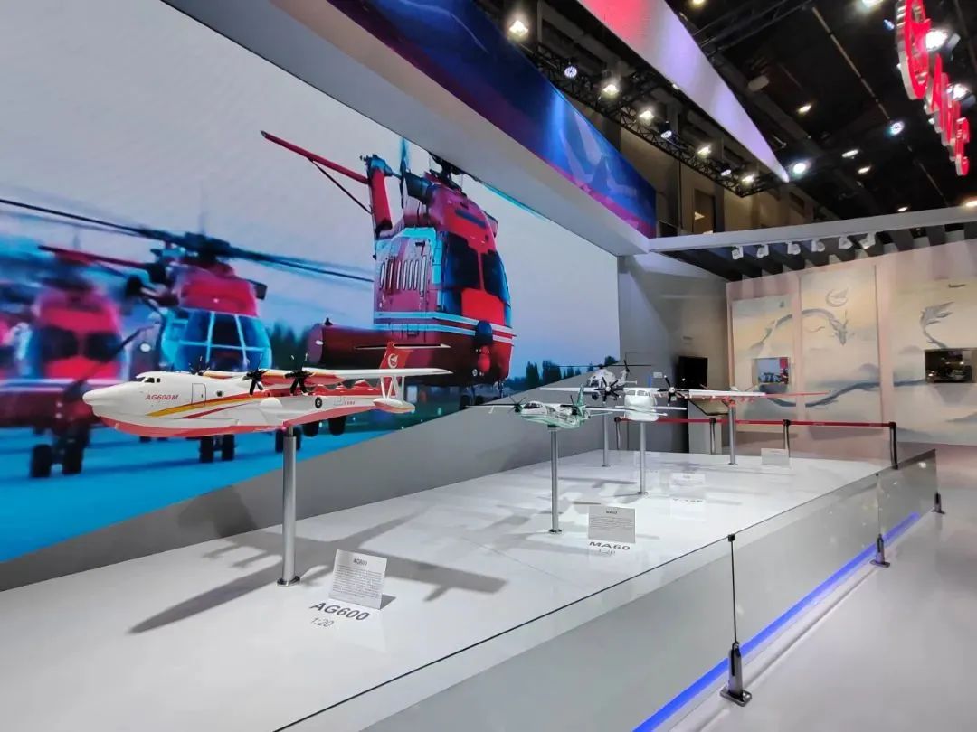 馆内展陈分为“航空应急救援体系”“空中攻防体系”“现代民用航空产业体系”“航空品牌文化”四个部分。其中,“20家族”“鲲龙”AG600、“翼龙”-X无人机等多项展品为首次登陆巴黎。