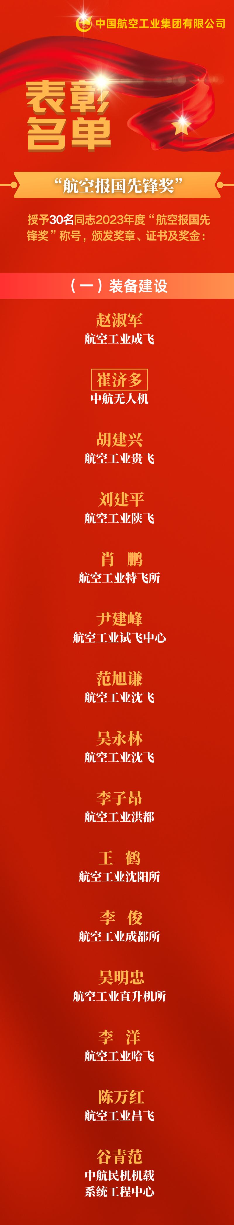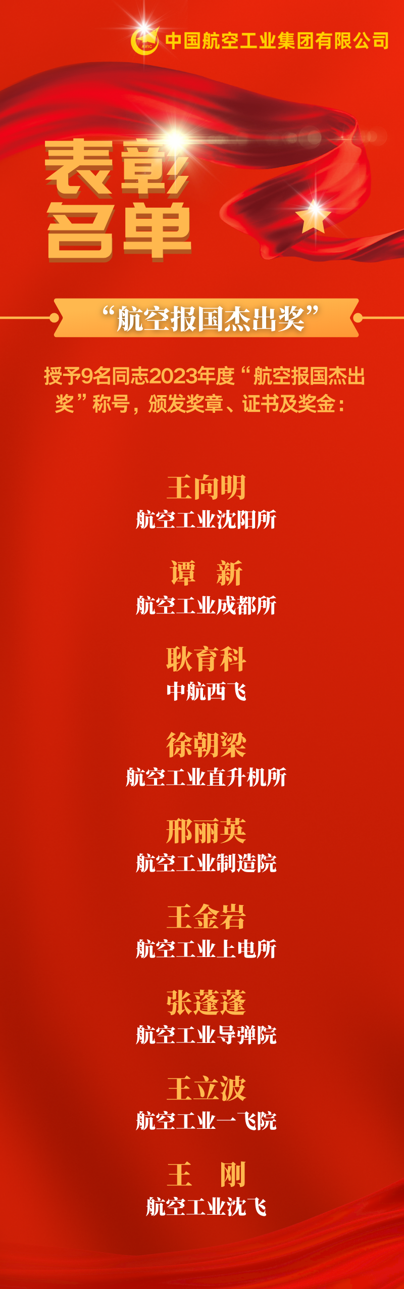 为深入学习贯彻习近平总书记在“国家工程师奖”首次评选表彰之际作出的重要指示精神,大力表彰先进、选树典型,打造大批创新性、基础性、战略性人才队伍,在全集团营造见贤思齐、埋头苦干、攻坚克难、创新争先的浓厚氛围,航空工业党组决定授予以下团队和个人“航空报国杰出奖”和“航空报国先锋奖”。