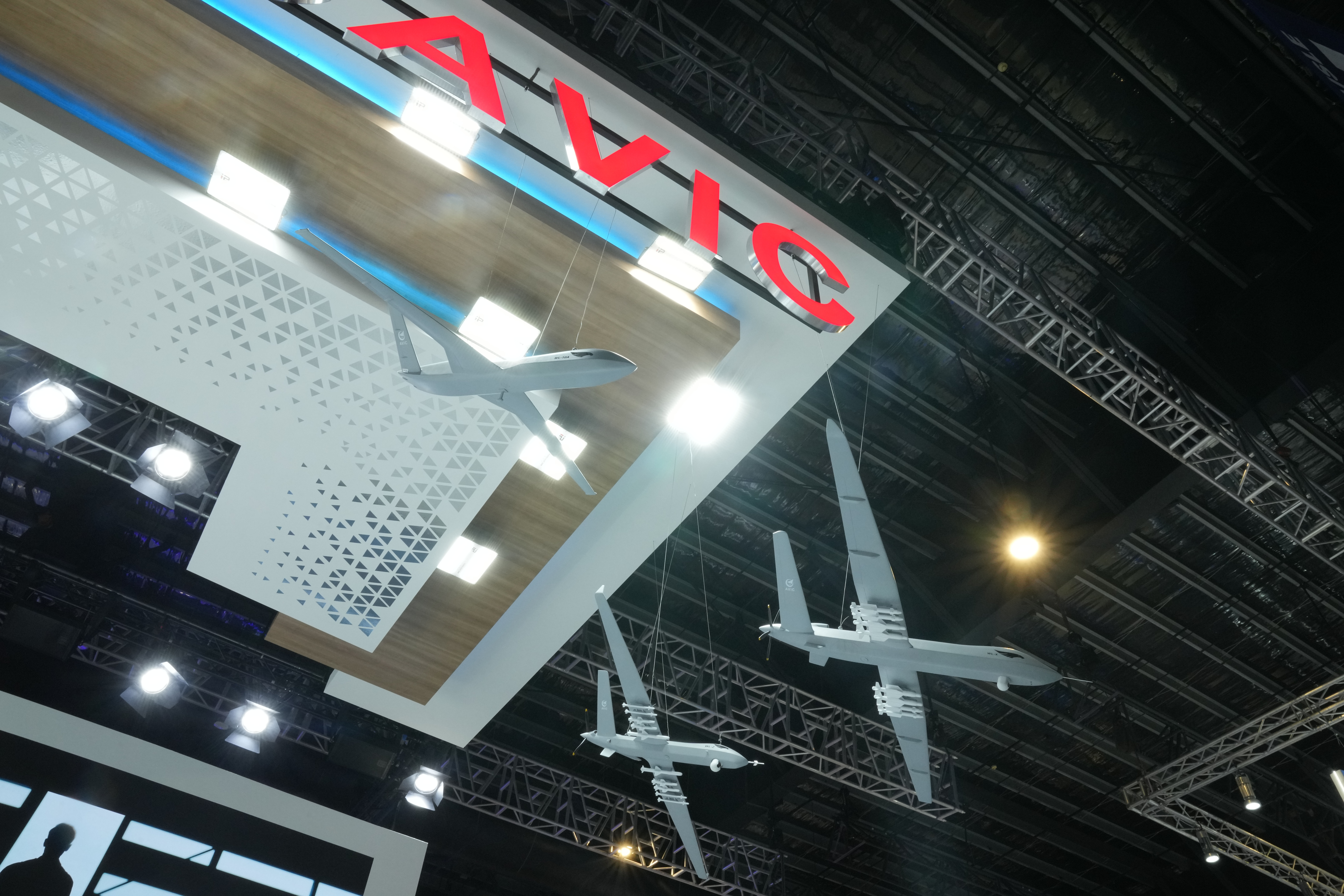 2月20日,2024新加坡航展开幕,航空工业展出多型无人机模型。摄影:姚旭东。