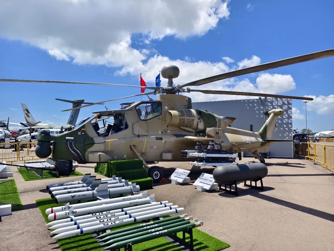 室外静态展区展出了直10ME武装直升机,这是该机型真机在境外航展首次亮相。直10ME是一款全新中型多用途攻击直升机,具有良好的飞行性能和超低空机动性能,打击火力强,战场生存性高,人机工效好,可靠性、维修性高,保障资源完整先进,可在全天候、复杂的战场环境和野外保障条件下遂行多种作战任务。