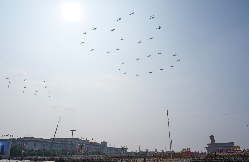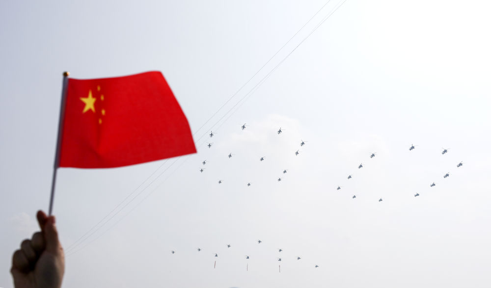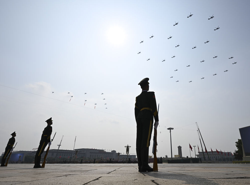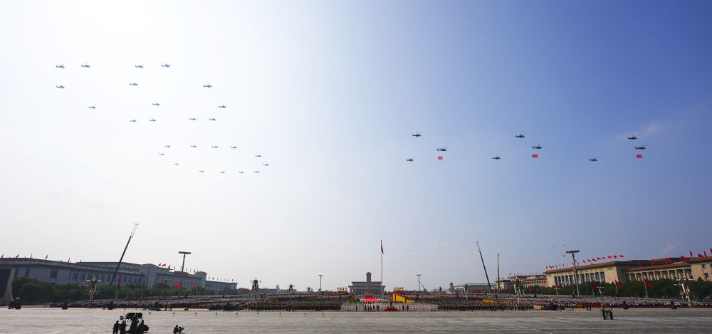 80!空中护旗梯队飞过,分列式开始