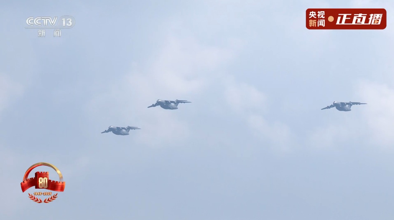 运输机梯队来了,运20A、运20B编成两个楔队,以战斗姿态编组飞过天安门广场。