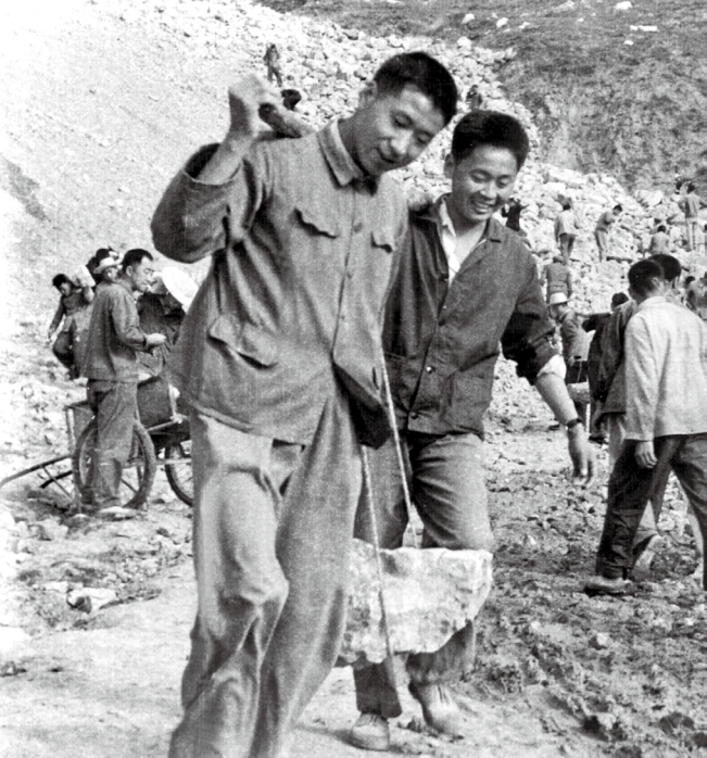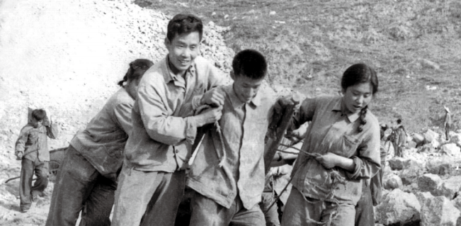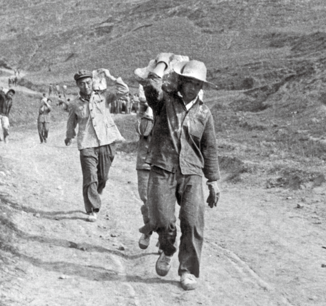 1970年冬,建设者们身背肩扛,将石头运往工地