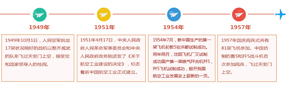1954年7月,新中国生产的第一架飞机初教5在洪都试制成功。同年同月,沈阳飞机厂又试制成功国产第一架喷气歼击机歼5,歼5飞机试制成功,掀开我国航空工业发展史上崭新的一页。【详细>>】